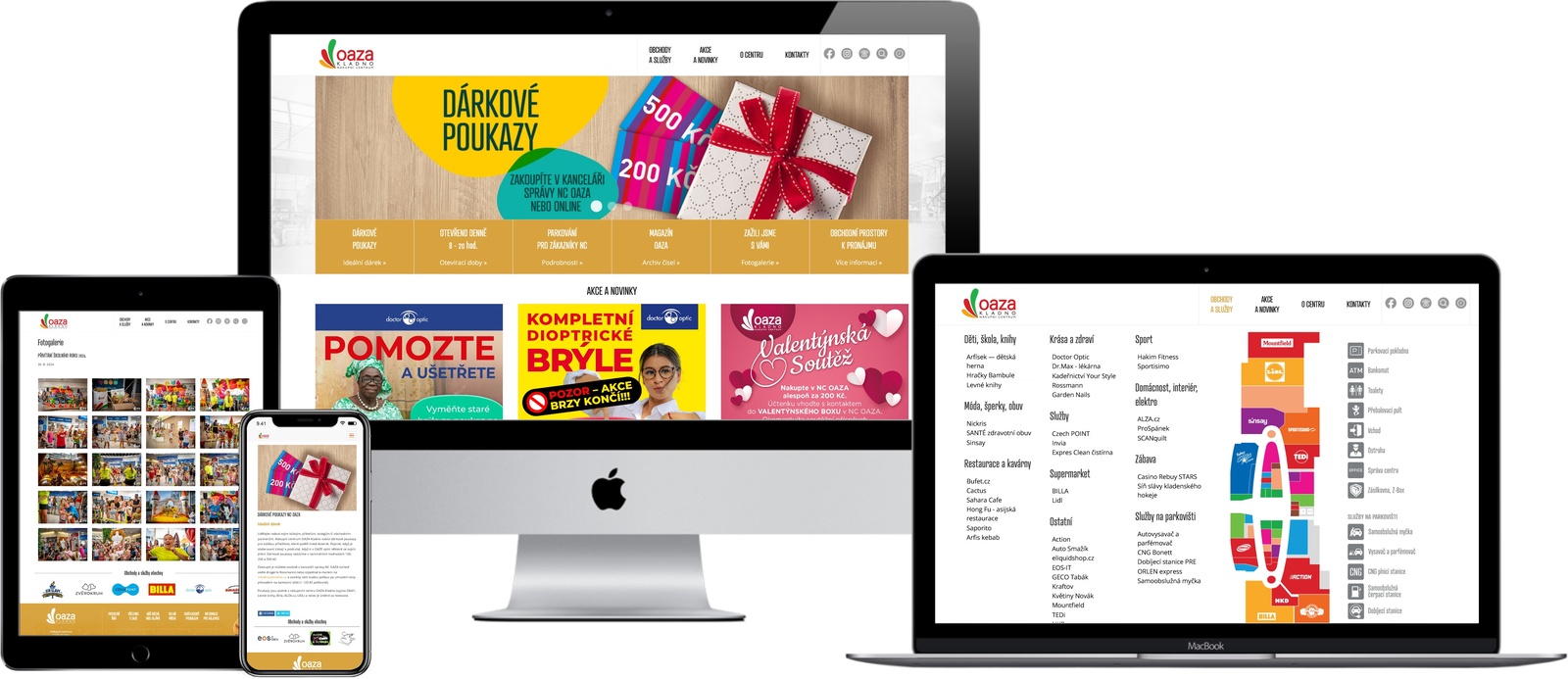 Webová stránka Nákupního centra OAZA v Kladně obsahuje interaktivní mapu obchodů, profilové stránky jednotlivých nájemců, blog aktualit a fotogalerie z proběhlých akcí pro zákazníky. Administrace umožňuje pohodlnou správu pro asistentku marketingu.